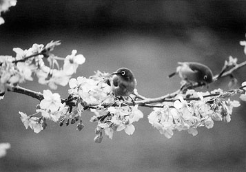 一,花密を吸う鶯の番あり 夢中になりて我れに気付かず